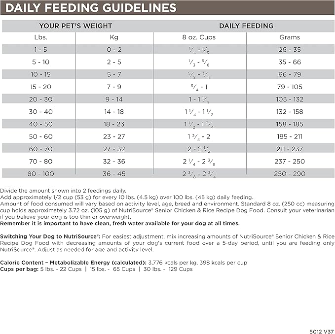 - As a member of our grain inclusive series of dog foods, NutriSource Senior Chicken & Rice Recipe is formulated to meet AAFCO guidelines for maintenance of adult dogs