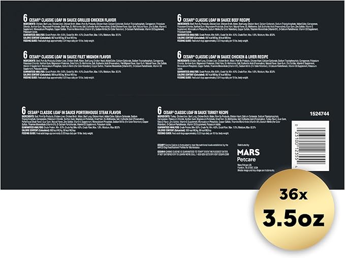 Cesar Wet Dog Food Classic Loaf in Sauce Grilled Chicken, Filet Mignon, Porterhouse Steak, Beef, Chicken & Liver and Turkey Variety Pack 3.5 oz. Easy Peel Trays (36 Count, Pack of 1)