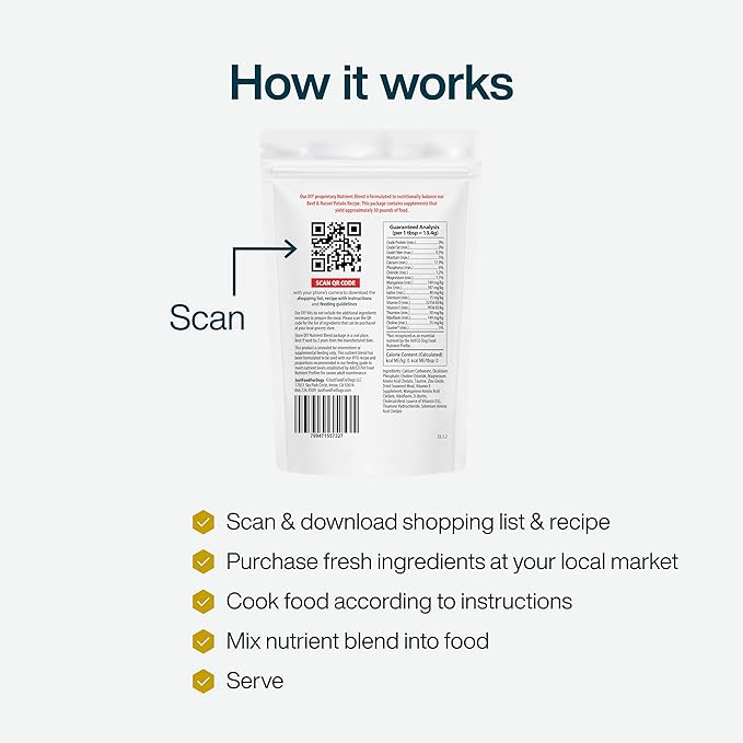 - FOR COMPLETE & BALANCED HOMEMADE DOG FOOD: The Beef & Russet Potato DIY is a Proprietary Nutrient Blend perfectly balanced for active adult dogs or underweight dogs.
