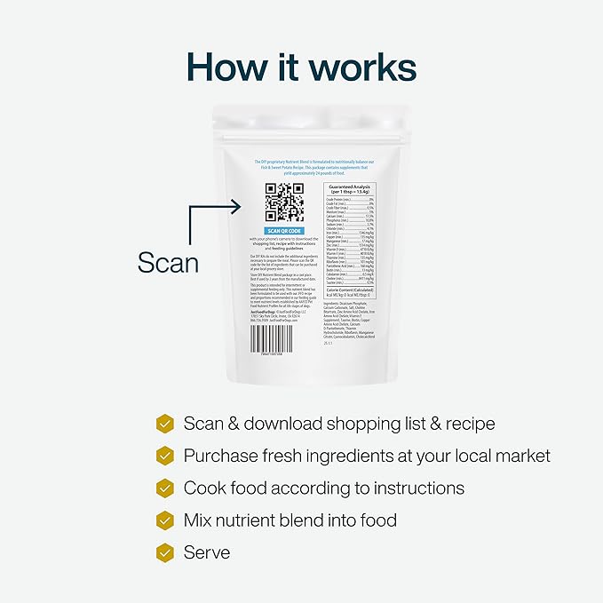 - FOR COMPLETE & BALANCED HOMEMADE DOG FOOD: The Fish & Sweet Potato DIY is a Proprietary Nutrient Blend perfectly balanced for adult dogs, overweight dogs, and puppies.