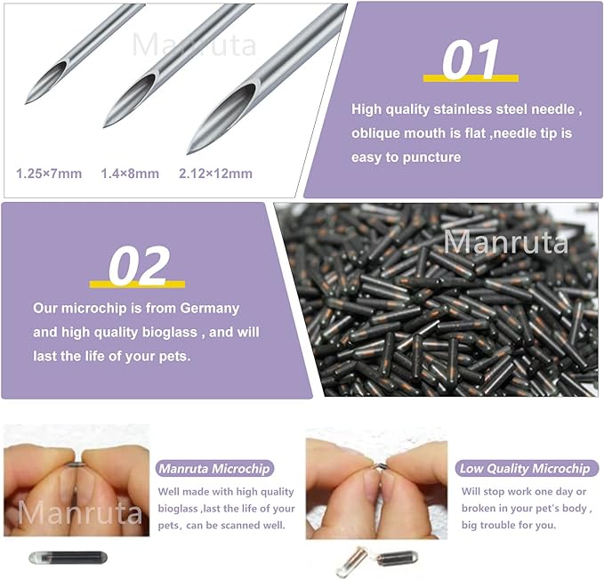 - {Microchip Quality is Very Important }:Manruta Microchip, from Germany ,well made with high quality bioglass ,last the life of your pets, can be scanned well. If you buy Low Quality Microchip, will stop work one day or broke in your pet’s body , big trouble for you and your pets.