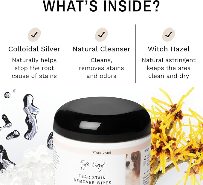 - SAFE AND NATURAL INGREDIENTS: Eye Envy Tear Stain Remover Wipes are made from non-irritating, natural ingredients that are not toxic to dogs. Free from dyes, parabens, peroxide, steroids, and antibiotics. Hypoallergenic and fragrance-free. Safe for puppies.