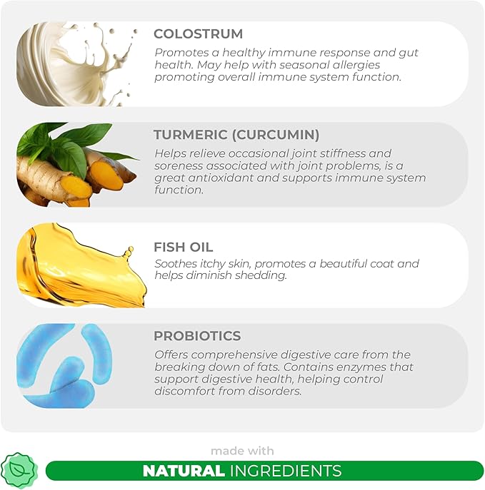 - Omega 3 for Special Protection - Contains natural Omega 3 Fish Oil which has fatty acids that provide skin and immune support for dogs with allergies.