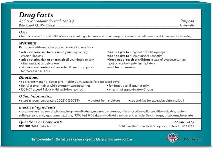 - Precautions: This medication should not be combined with any other medication or product containing Meclizine. As with all supplements and medications, be sure to consult with your veterinarian first.