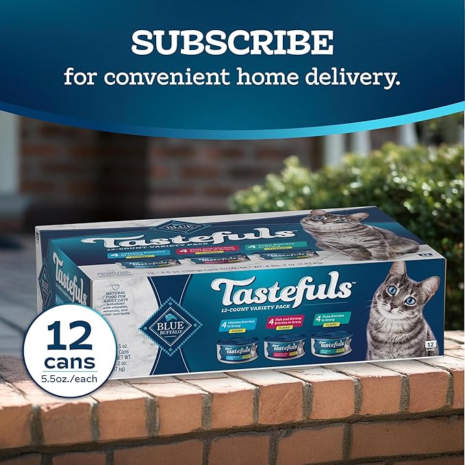 - Contains One (1) Variety Pack of BLUE Tastefuls Natural Flaked Wet Cat Food, Tuna, Chicken and Fish & Shrimp Entrées in Gravy 5.5-oz cans (12 count - 4 of each flavor)