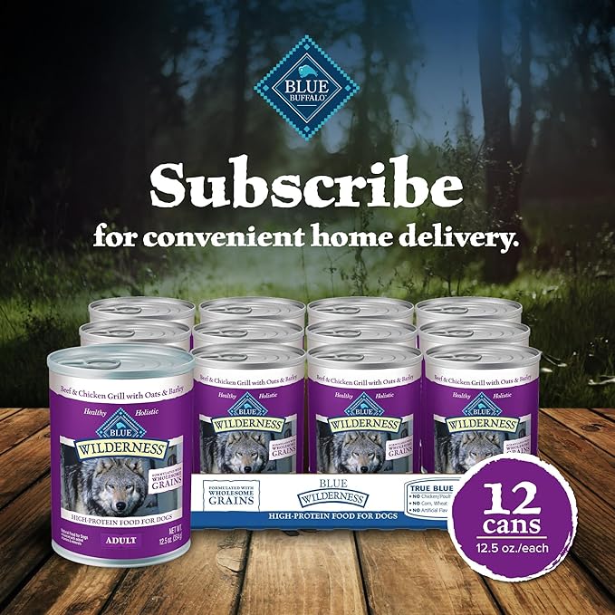 - Contains: Twelve (12) 12.5-oz. cans of BLUE Wilderness High-Protein Adult Wet Dog Food, Beef & Chicken Grill with Wholesome Grains