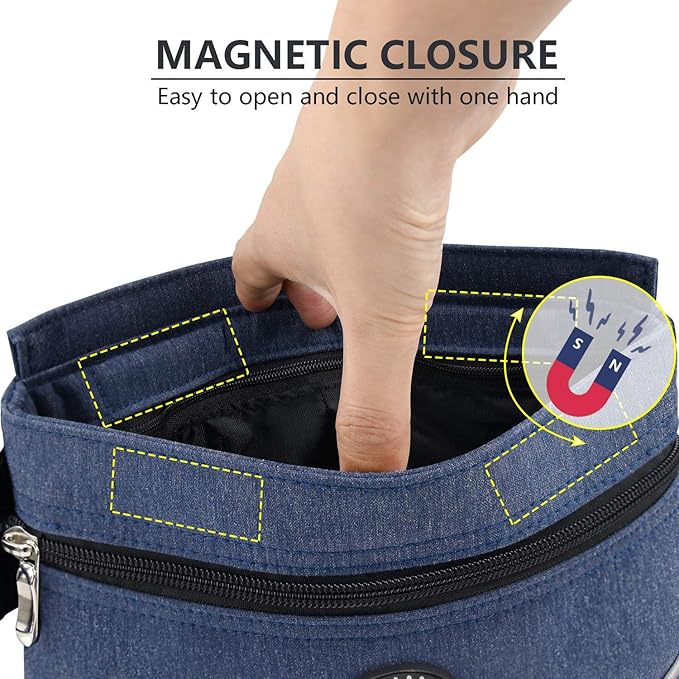 - INNOVATIVE MAGNETIC OPENING DESIGN: Our treat pouch uses the innovative one-hand magnetic opening design, you can easily open or close the main bag. In additional, the main bag consists of two separate bags, you can put different dog food or toys separately.