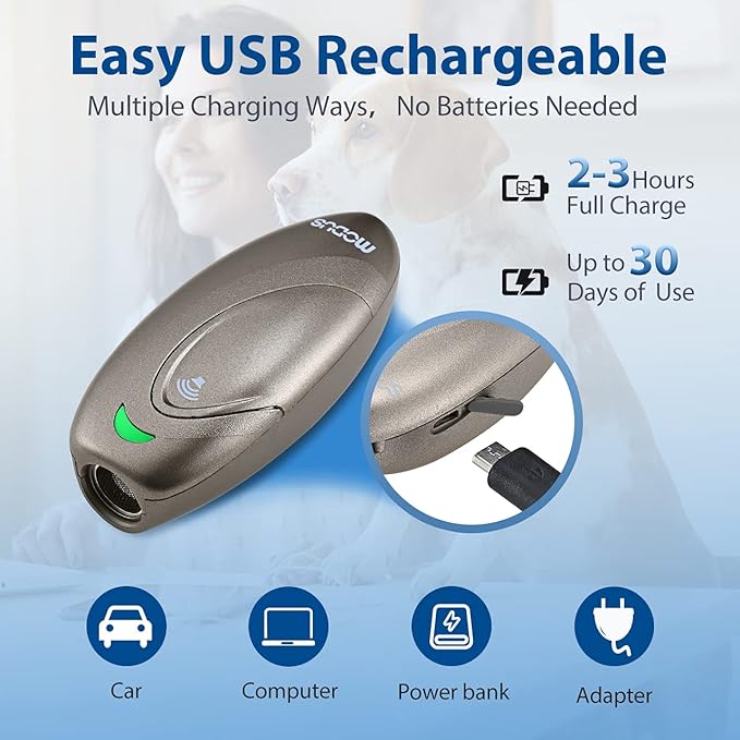 - Ultra Battery Life and Daily-Use Time Up to 30 Days: MODUS Dog Barking Deterrent Device is equipped with a large capacity USB rechargeable battery of 750mAh. The included USB cable is suitable for multiple charging modes such as Car, PC, power bank, adapter, etc. Our dog barking control devices support a long daily-use time up to 30 days after 2-3 hours full charged, saving you the endless hassle and investment in batteries.