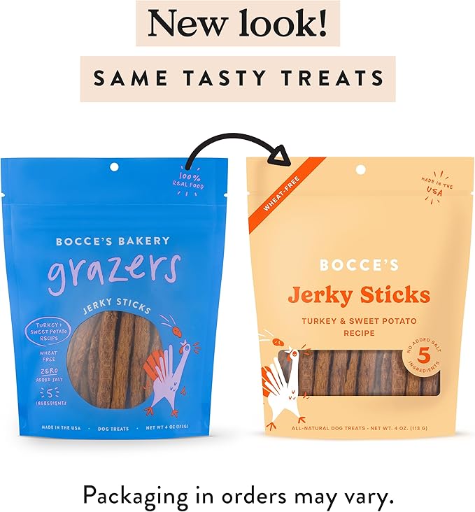 Bocce's Bakery Jerky Stick Dog Treats, Wheat-Free, Made with Limited-Ingredients, Baked in The USA with No Added Salt or Sugar, All-Naural & High-Protein, Turkey & Sweet Potato, 4 oz