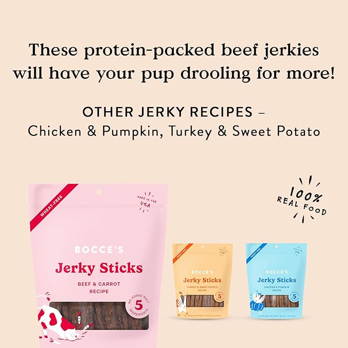 Bocce's Bakery Jerky Stick Dog Treats, Wheat-Free, Made with Limited-Ingredients, Baked in The USA with No Added Salt or Sugar, All-Naural & High-Protein, Beef & Carrot Recipe, 4 oz