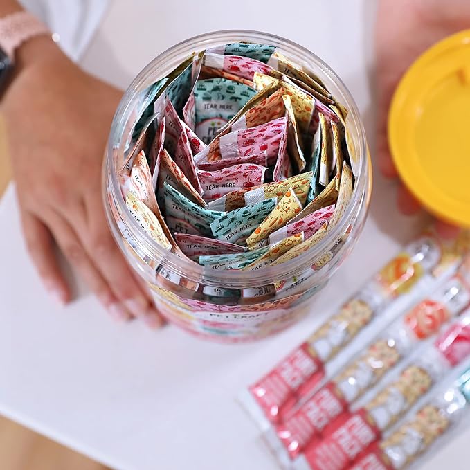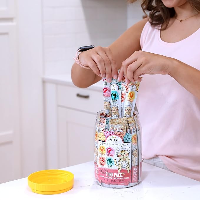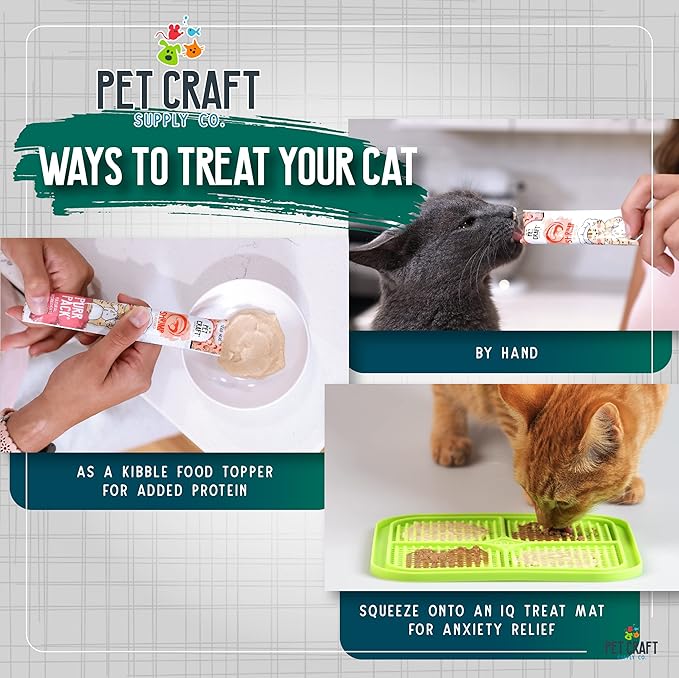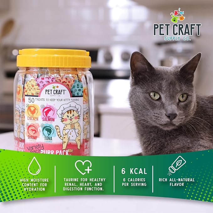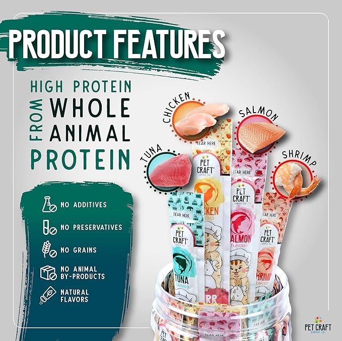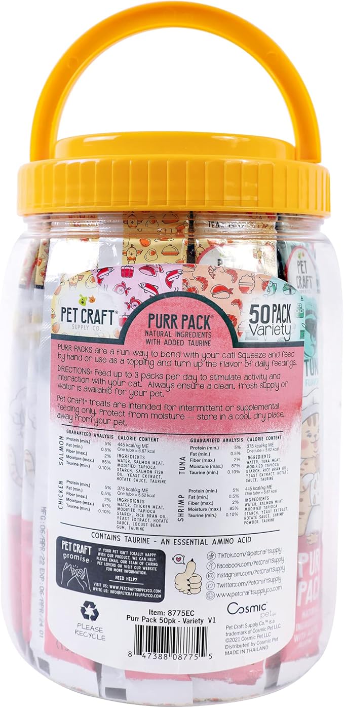 Pet Craft Supply Lickable Cat Treats Variety Pack (Salmon, Shrimp, Tuna, Chicken) 50ct Tub, Squeezable Tubes High Protein Cat Puree Wet Food or Food Topper