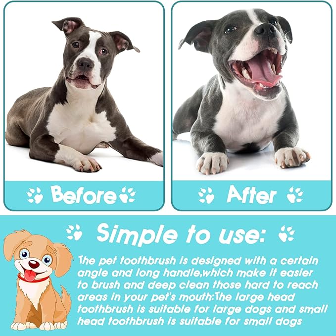 - ★ CONVENIENT EASY TO USE: Our Dual Ended Long dog Toothbrush is angled and narrow which means it is easy to maneuver and allows for a deep clean for those hard to reach areas in your pet's mouth.large head toothbrushes apply to large dogs and small headtoothbrushes are perfect for small dogs, Which means an easier way for you to administer a thorough professional quality cleaning.