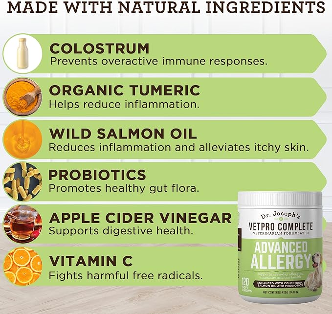 - Superior Ingredients - Our pet allergy medicine for dogs is rich in essential Omegas and Wild Alaskan Salmon. Our omega bites for dogs enhance healthy heart, joint, & brain functioning, and provides a skin & coat defense for dogs. Colostrum for dogs stimulates an under-active immune system & regulates an overactive immune system that can cause allergies. Inflammation can cause allergies and gastrointestinal problems, so we add organic Turmeric for its anti-inflammatory properties.