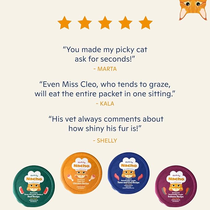 Made by Nacho Wet Cat Food, Minced Tuna and Cod in Bone Broth for Hydration with Prebiotics, High Protein, 2.5oz Cups (10 Pack)
