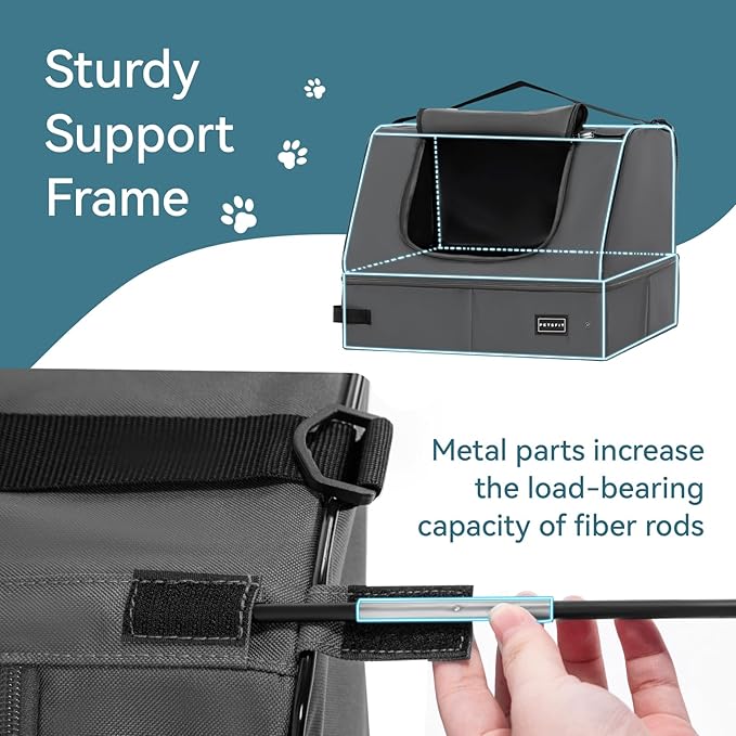 - Sturdy Support Frame: the portable cat litter box is roomy(17" Lx13" Wx12.5" H) and durable, for the edges of the litter box, we use a rubber bone, and for the top, we employ fiber rods. In the middle of the fiber rods, we incorporate metal parts to ensure that the entire litter box is not only sturdy on the outside but also remains robust and does not collapse when the cat is digging in the litter inside.