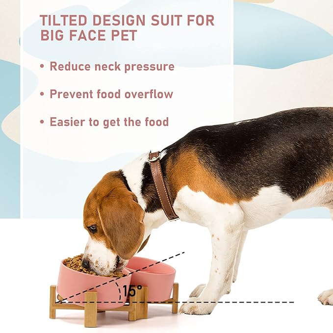 - CERAMIC MATERIAL: SPUNKYJUNKY Tilted Dog Bowl Set uses high temperature fired safe ceramics with a heightened wooden stand to provide a healthy feeding environment for your pet
