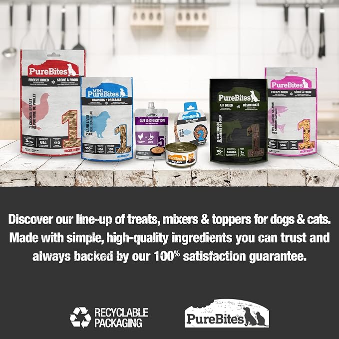 - In an effort to do our part, PureBites freeze dried treats are packaged in recyclable bags that we can recycle today for a better tomorrow; all PureBites treats, food, mixers, and toppers are always backed by our 100% money-back satisfaction guarantee