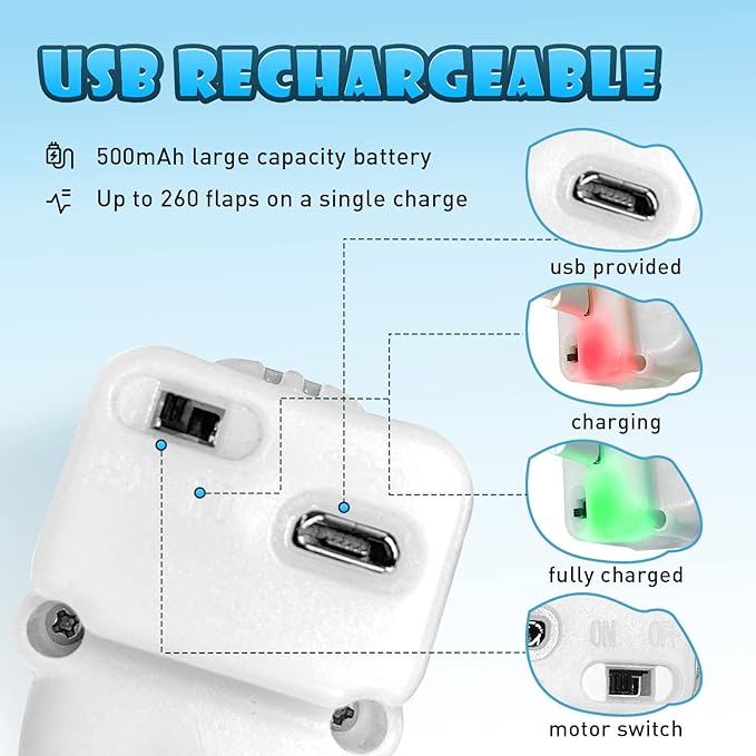 - USB Rechargeable: This toy can be charged via USB, saving the trouble and cost of replacing the battery. A USB charging cable is included in the package. When charging, the red light is on. When fully charged, the green light is on. A full charge can support up to 260 vibrations and chirps