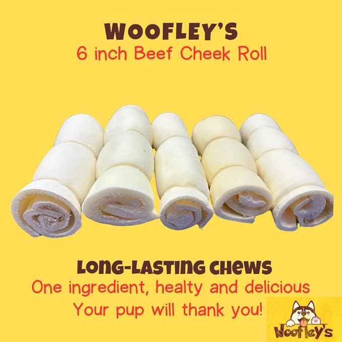 Woofley's 5-6" Buffalo Beef Cheek Roll -(10 Count)- Beef Cheek Rolls for Dogs - Long Lasting Natural Dog Chews