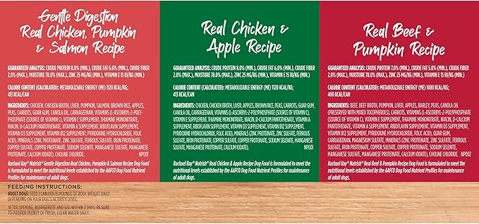 - WET DOG FOOD VARIETY PACK: Contains twelve (12) 13-ounce cans of wet dog food: four (4) Real Chicken & Apple Recipe, four (4) Real Beef & Pumpkin Recipe and four (4) Gentle Digestion Real Chicken, Pumpkin & Salmon Recipe