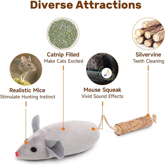 - Squeak Mice β Make play fantastic with the 3 plush squeaking mice toys. The cat toys make lifelike mouse chirping sounds once playtime begins, beckoning every bat, bite, chew, and chase! The mice kitten toys keep quiet when left alone to save battery power