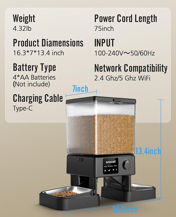 - 5G Stable Wi-Fi Connection: oneisall automatic cat food dispenser can connect to 5G/2.4G Wi-Fi. Compared to 2.4G Wi-Fi, this feeder with 5G feature would connect to network more stably. You donβt need to worry about failing to control when you are out of home