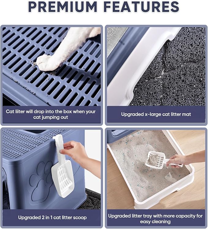 Cat Litter Box with X-Large Litter Mat and Scoop, Large Foldable Litter Box with Lid, Enclosed Kitty Box,Front Top Entry Exit, Odor Control Easy to Clean (Upgrade Midnight)