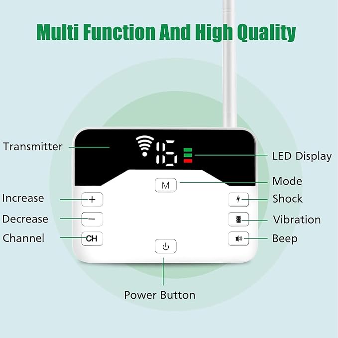 - 2.Remote Dog Training Collar Mode: Under remote training collar mode,there are 3 functions could be chosen from the panel directly: Beep,Vibration & Shock.9 levels of working strength could be adjusted. Equipped with rubber protective cover which makes your dog comfortable to wear. wireless pet containment system also emits static electricity without harming dog's hair.