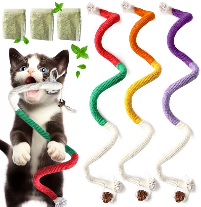 Cat Toys for Indoor Cats, Kitten Toys for Indoor Kittens, Catnip Rope Chew Toys for Teeth Cleaning, Interactive Cat String Toy, Kitty Kicker Toy, 3 Pack (Plus 3 Pouches of Catnip)