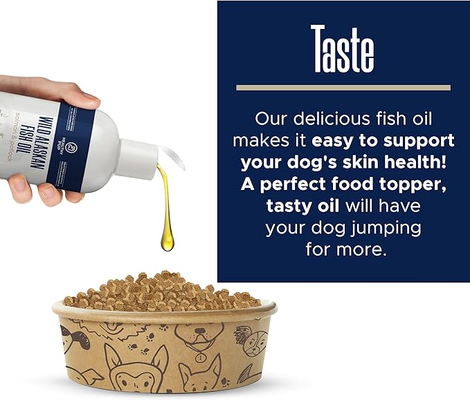 - Our Wild Alaskan Fish Oil dog food supplement comes with 8 oz. of salmon and pollock oil. There is also an optional pump cap for easy measuring and distribution. Made in USA.