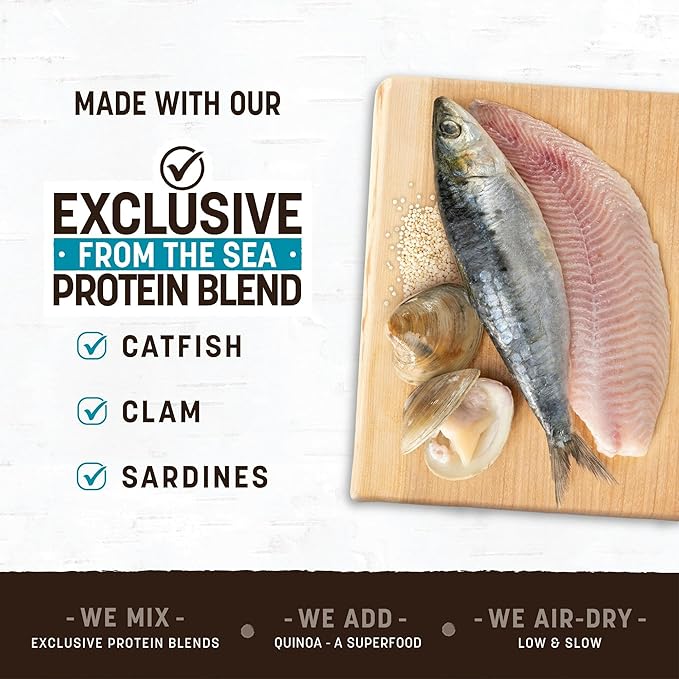 - EXCLUSIVE PROTEIN BLEND: Sustainably sourced catfish, clams, and wild-caught sardines. Enriched with quinoa