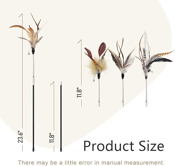 - [PLAY WITH YOUR CAT]: Every time you pick up the cat feather toys and just wave your wrist, it will instantly catch the cat's eye and the cat gets closer to you. So the length of the funny cat toy wand just happens to make the cat play around you. When the cat performs well, you can touch their in time. When you play with Kitten you will feel unprecedentedly relaxed and happy.