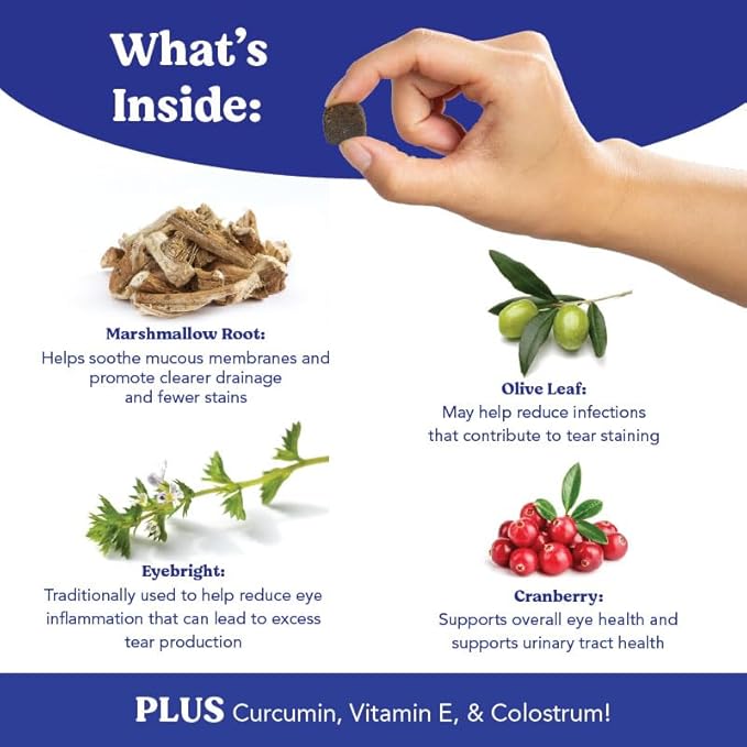 - QUALITY ACTIVE INGREDIENTS: Powered by a proprietary blend of key ingredients, Angels’ Eyes is composed of natural antioxidants with anti-inflammatory properties help keep your pet’s eyes bright and clear. Our Natural Plus formulation includes Eyebright, Olive Leaf, Marshmallow Root, and Cranberry to help reduce tear stains PLUS Curcumin, Vitamin E, and Colostrum for overall health.