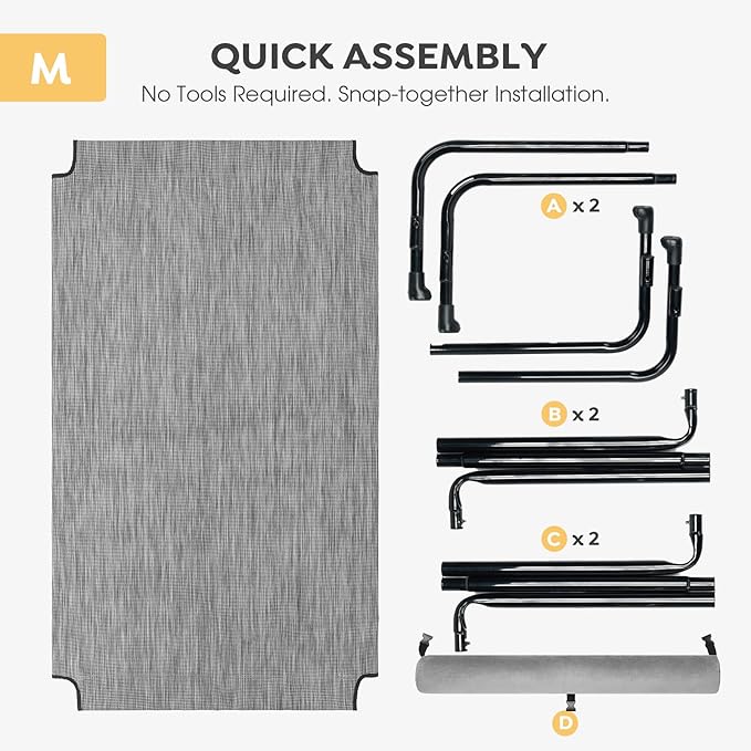 - Snap-Together Installation. Easy to Assemble. No screws and wrenches needed. Best idea as dog hammock bed and training platform. Lightweight and portable. Perfect for indoor, outdoor, picnic, camping, training… Quality sleep on the go!