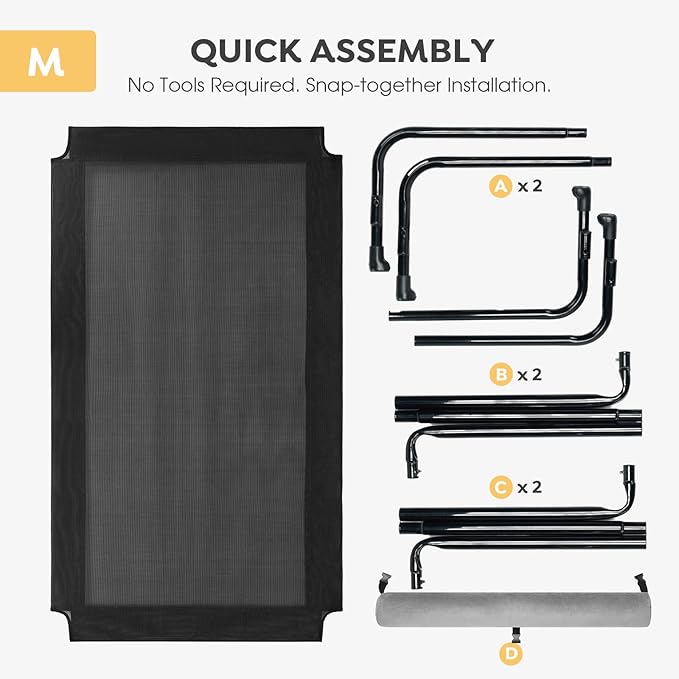 - Snap-Together Installation. Easy to Assemble. No screws and wrenches needed. Best idea as dog hammock bed and training platform. Lightweight and portable. Perfect for indoor, outdoor, picnic, camping, training… Quality sleep on the go!