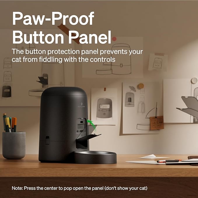 - Prevents Unintended Button Presses - The button protection panel on the battery-operated timed cat feeder not only gives the feeder a sleek and simple appearance, but also protects the operational buttons from accidental presses, thus ensuring every meal arrives as intended. To use the panel, simply press at the center to open it.