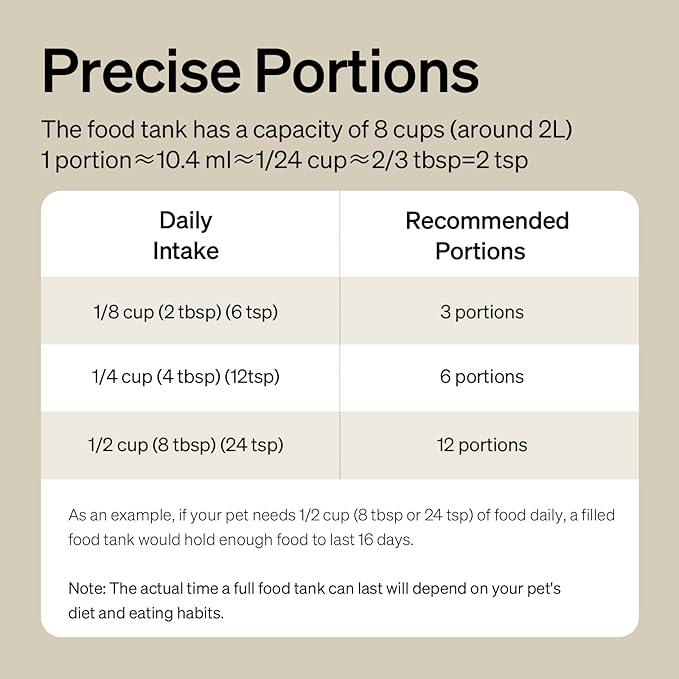 - Automatic Feeding Schedule - The PETLIBRO automatic cat feeder can support up to 6 meals per day, with 1-16 portions of food per meal. Easily set the feeding schedule that suits your pet's needs and make their eating habits more regular and healthy. (1 portion≈ 10.4ml ≈ 1/24 cup ≈ 2/3 tbsp ≈ 2 tsp, food portions may vary based on size, type, etc.)