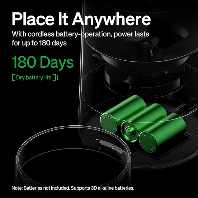 - Flexible Placement - The PETLIBRO Air automatic cat food dispenser offers two power options (battery or power cord). If you choose to use batteries as the main power source, three D alkaline batteries can provide up to 180 days of battery life, allowing you to place it wherever you want without being limited by electrical outlets. (Batteries not included, please search for B00000JHQE and B000JCCT9Y directly on Amazon)