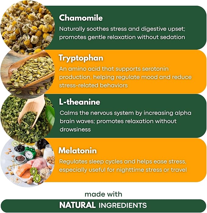 - [Hooman-Grade Ingredients]: Each strip is made with chamomile, L-tryptophan, melatonin, and L-theanine—ingredients carefully chosen for their calming properties. Unlike some chews, ZenMelts are non-drowsy, so your pup can stay calm without feeling sleepy.