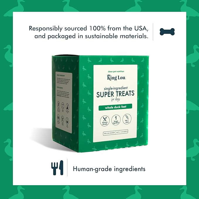 King Lou Pets - Whole Duck Feet for Dogs - Single Ingredient Treat - Dehydrated Dog Treats - USA-Made Dog and Cat Treats - Collagen, Glucosamine, Chondroitin for Hip and Joint Health - 40 Count