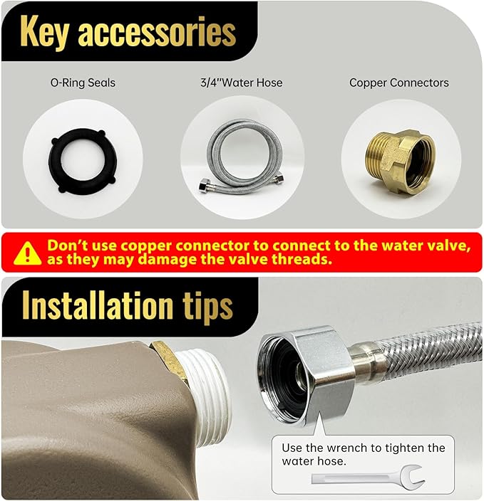 - Friendly Reminder: 1.In areas with high water pressure, the valve may malfunction. Please contact customer service for return. 2. If there is any water leakage at the hose connections, Please put two two"O"sealing rings in the copper connector. Copper connectors and "O"-ring seals are crucial components for addressing potential leaks. If it still leaks, consider the thread is not suitable