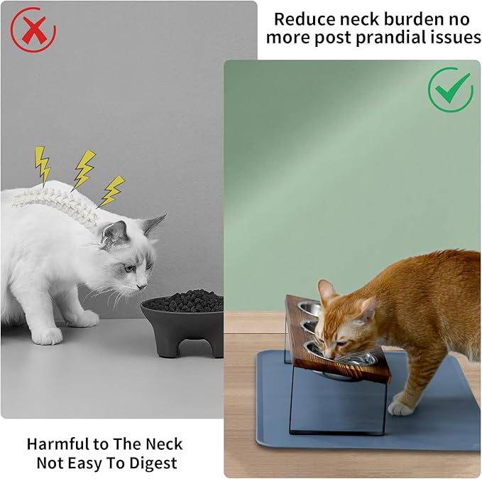 - 【Pet Safe Material】The cat food and water bowl set are made of premium food-grade stainless steel bowls which are rust-resistant and removable. Dishwashers safe and easy to clean. Natural and odor-free wood is waterproof and durable.