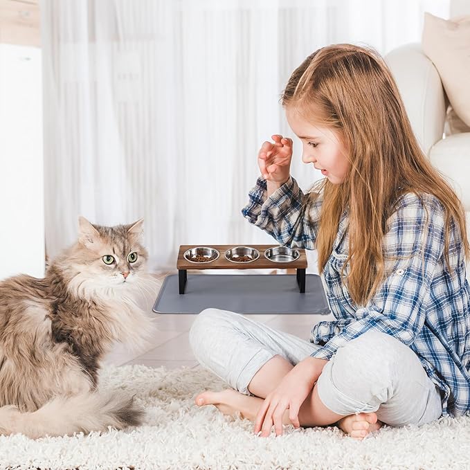 Upgraded Elevated Cat Bowls with Food Mat,15°Tilted Stand Anti Vomiting Raised Cat Dishes for Food and Water,3 Stainless Steel Bowls for Cats and Puppy(Rustic Brown)