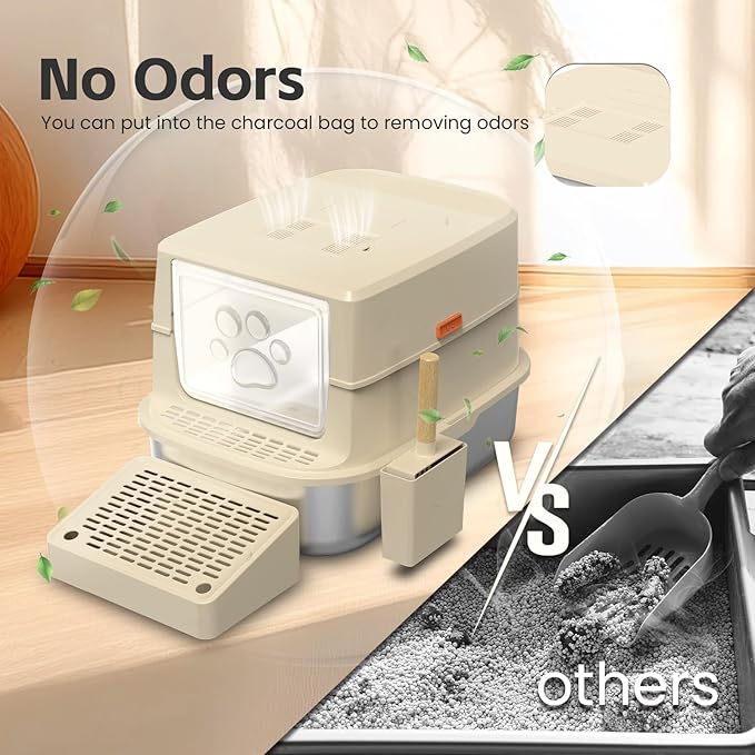 - STAINLESS STEEL CAT LITTER BOX: The cat litter box is made of high-quality stainless steel, which is not easily scratched by claws or shovels and causes rust. Unlike traditional plastic litter boxes, its smooth non-stick bottom allows excrement to slide off the surface easily, making it easy to clean and durable, reducing the need to frequently change the box. In addition, the ABS plastic shell is firmly buckled onto the litter box, and its sealing greatly reduces the risk of urine leakage.