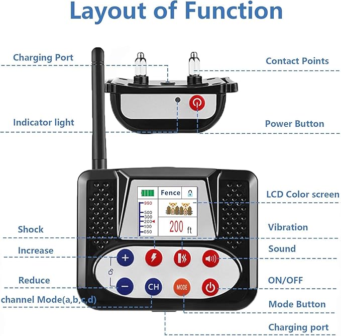 - 4.Rechargeable : Both transmitter and receiver collars are rechargeable. The transmitter takes 4-5 hours and the receiver only 2-3 hours to fully charge. When the battery power is low, the LED red lightwill flash. The wireless dog boundary receiving collar is made of IPX7 material. Radio signals and cell phones may cause signal interruptions. We recommend avoiding using these devices in close proximity to the system.