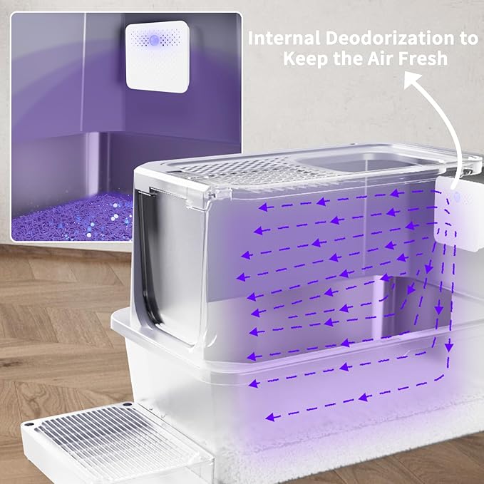 - 【Deodorization Design】The cat litter box has a built-in deodorizing filter, which can sterilize and deodorize the litter box, eliminating odors and keeping the air fresh. Charged by USB port, it is very convenient to use and can bring you and your cat a more comfortable experience.