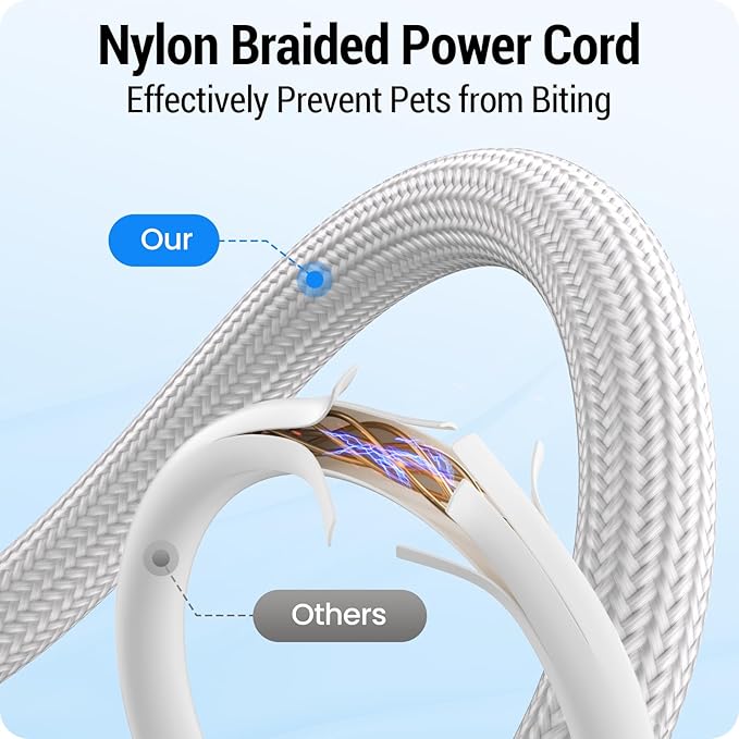 - Dual Power Supply : The automatic dog feeder has two power supply systems. DC 5V power adapter for daily use of the automatic cat feeder wifi. The 3 D cell batteries (not include) ensure your pet has a continuous supply of food when your home loses power. You can enjoy your vacation or work away from home with peace of mind( Dual power supply recommended ). The specially made anti-bite nylon braided line of this automatic pet feeder can effectively prevent your line-biting pet from chewing it.