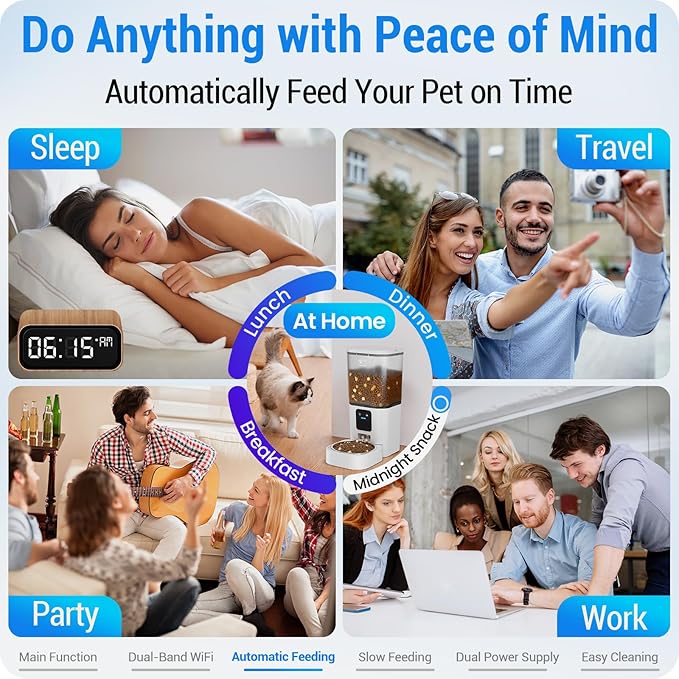 - Remote APP Control : The Automatic cat feeder can connect to 2.4GHz or 5GHz network. Program and monitor your pet's meals anywhere anytime through the “Smart Life” App on your iOS or Android smartphone. You can set up a feeding schedule of up to 30 meals per day, with 1-12 portions per meal. Also reward your pet by feeding it remotely from outdoor via the app. The app can also check feeding records and share to family members' smartphones for control.
