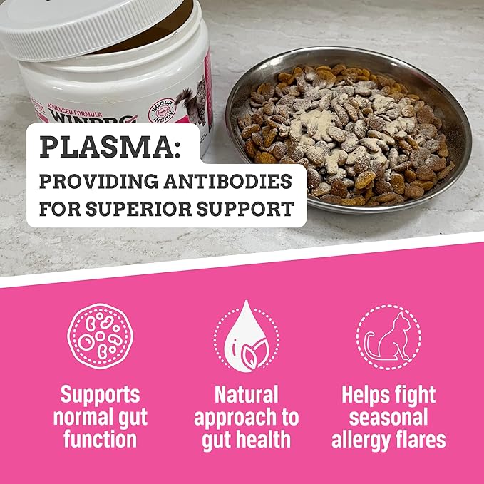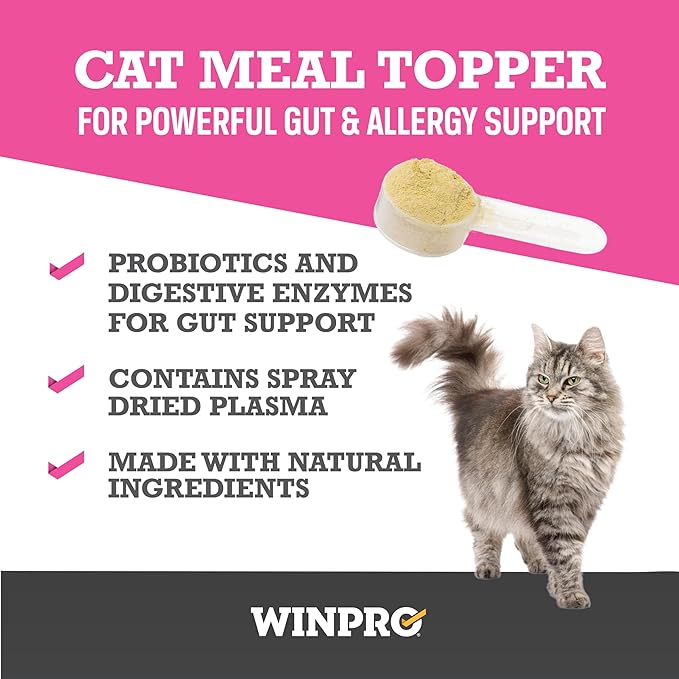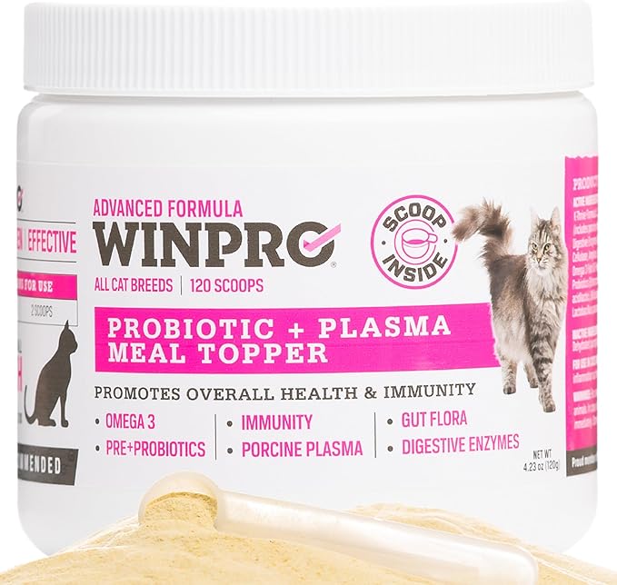- PROBIOTIC MEAL TOPPER FOR CATS: Contains 120 Scoops of WINPRO Probiotic Plasma Meal Topper Powder. Both prebiotics and probiotics promote gut health for cats by improving gut flora and supporting gut health. Our unique cat probiotic meal topper formula pairs spray-dried plasma with other key ingredients to combat gut inflammation and boost their immune support system. This powder seamlessly joins mealtime as a cat food topper designed for and loved by cats of all breeds and ages.