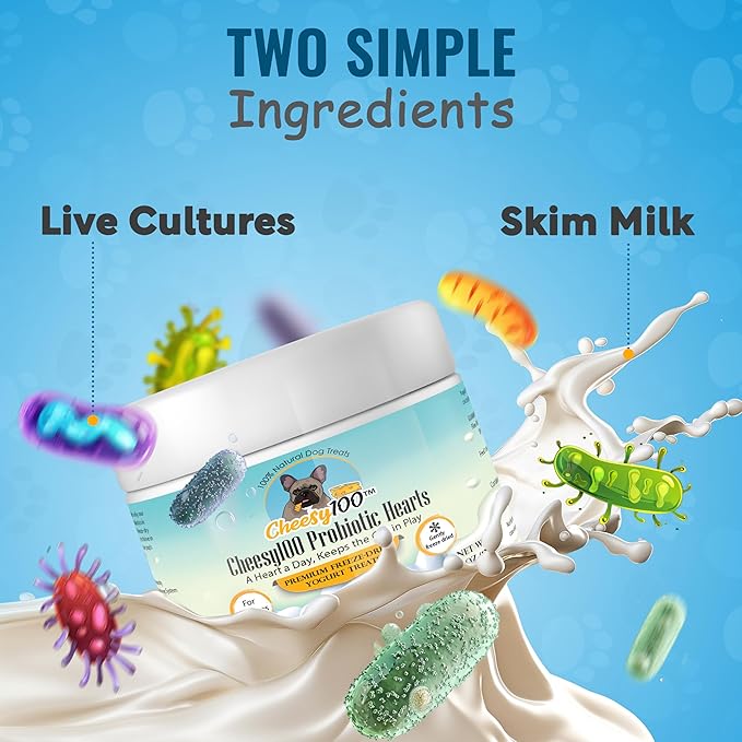 - We know your dog’s health is a top priority—because we’re dog lovers too. That’s why Cheesy100 Probiotic Hearts are made with premium ingredients and a whole lot of care, combining functional health benefits with a taste dogs crave.